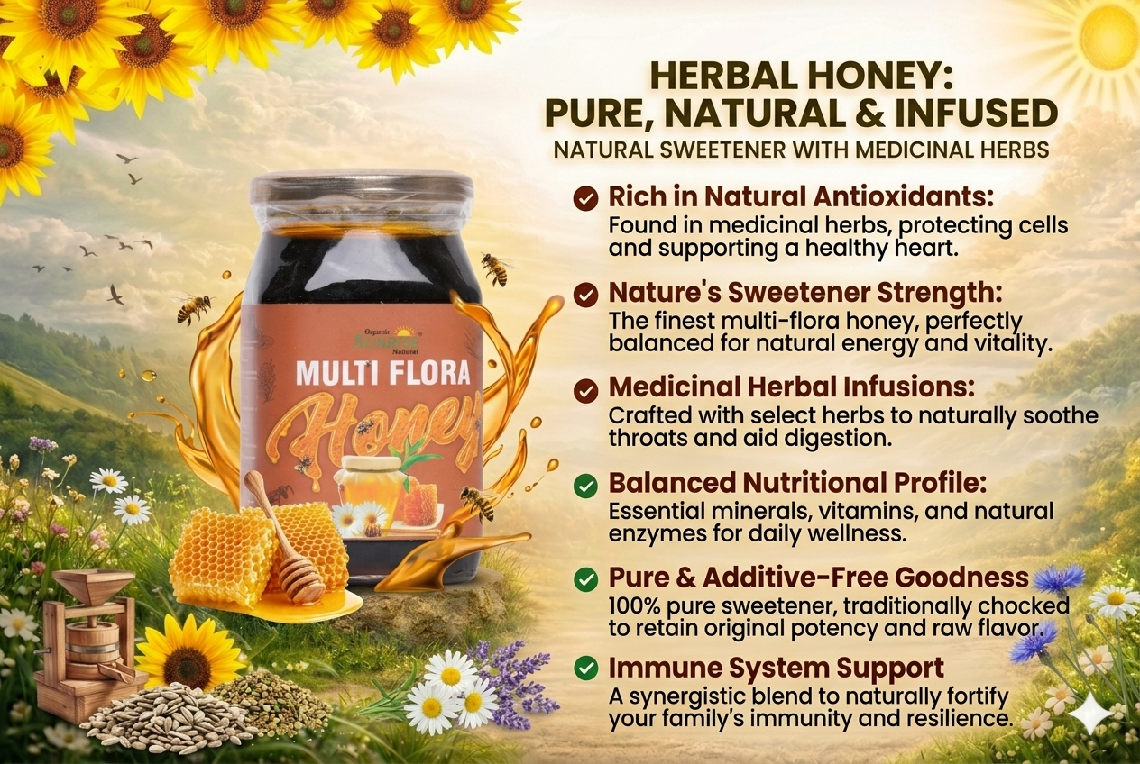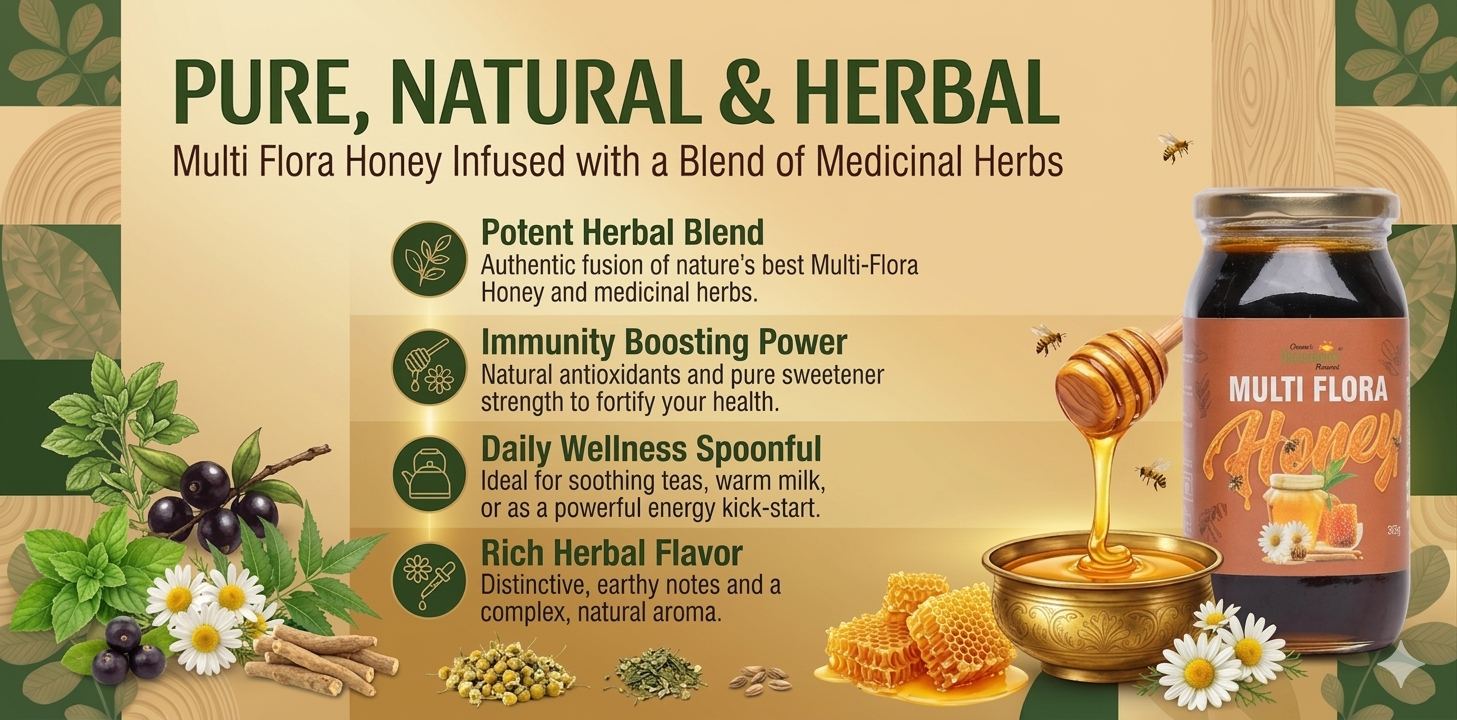 Herbal Honey is a natural sweetener made from high-quality nectar and infused with beneficial herbs, offering both taste and health benefits.