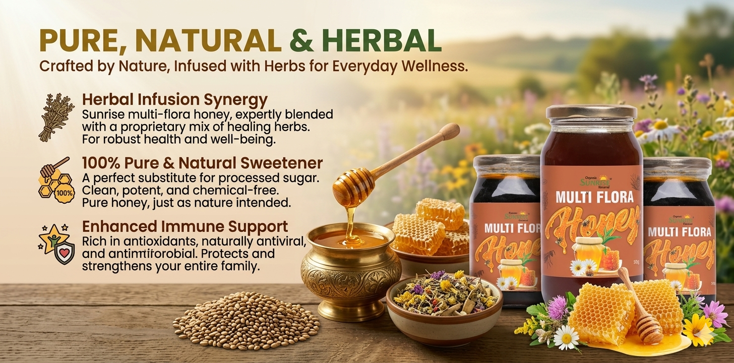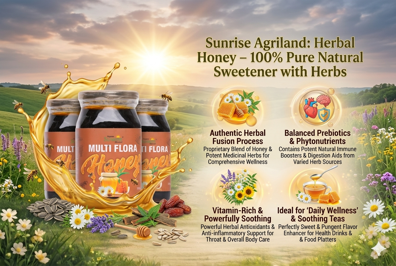 From boosting immunity to replacing refined sugar, kitchens across India rely on Sunrise Agriland Farms. Our Herbal Honey delivers natural sweetness with the added goodness of herbs—supporting a healthier lifestyle with every drop.