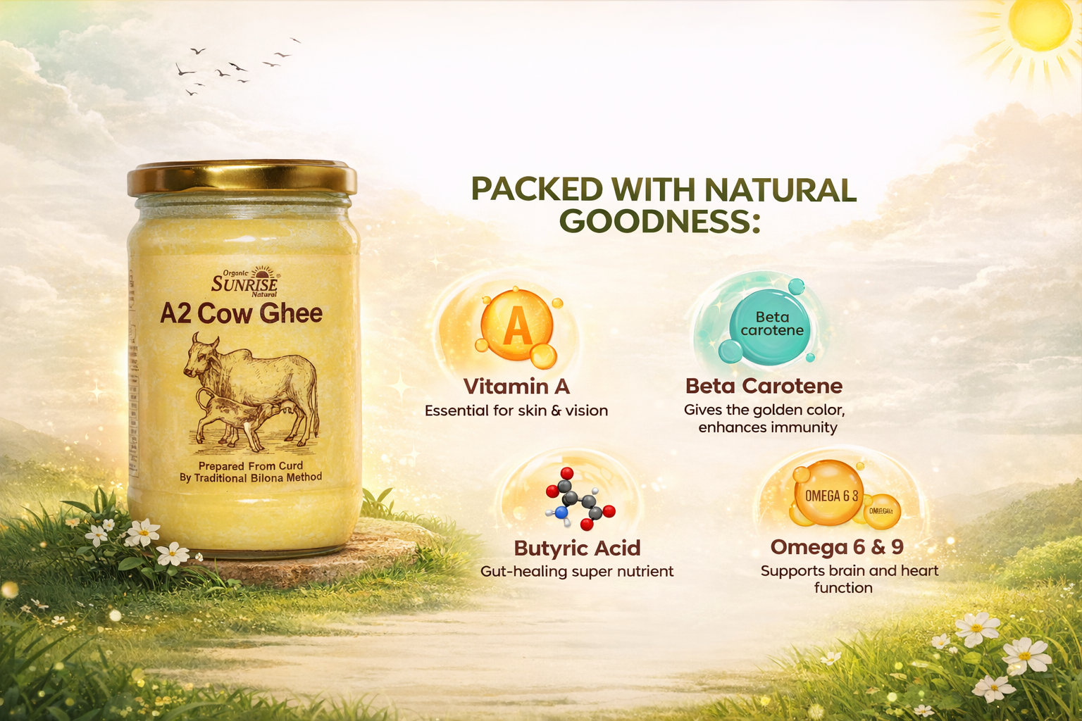 A2 Ghee is made exclusively from A2 milk sourced from indigenous cow breeds. A2 milk naturally contains beneficial nutrients like A2 beta-casein and omega-3 that are not found in A1 milk. A2 milk is also easily digested by some people, unlike A1 milk. Nei Native A2 Ghee is prepared from A2 milk using the traditional Bilona method, which delivers aromatic ghee that is richer in taste and nutritional value.
