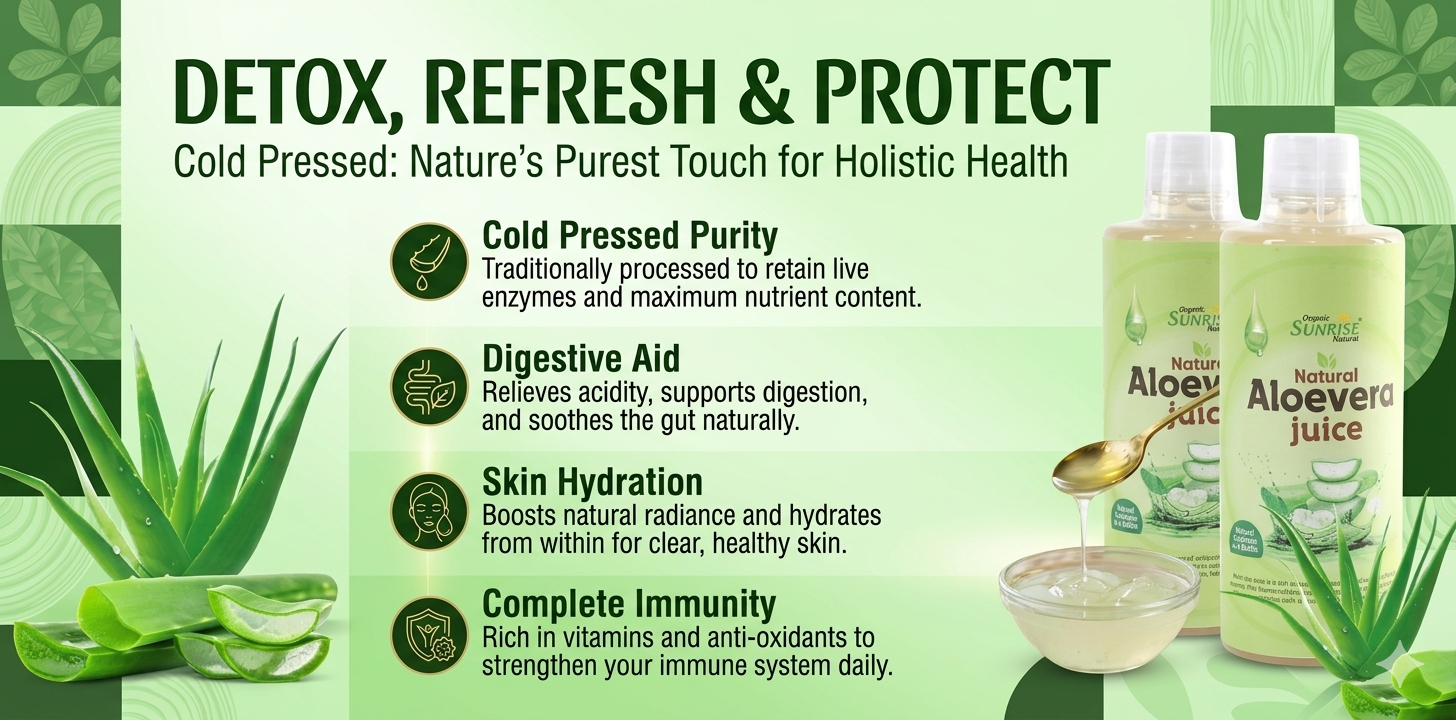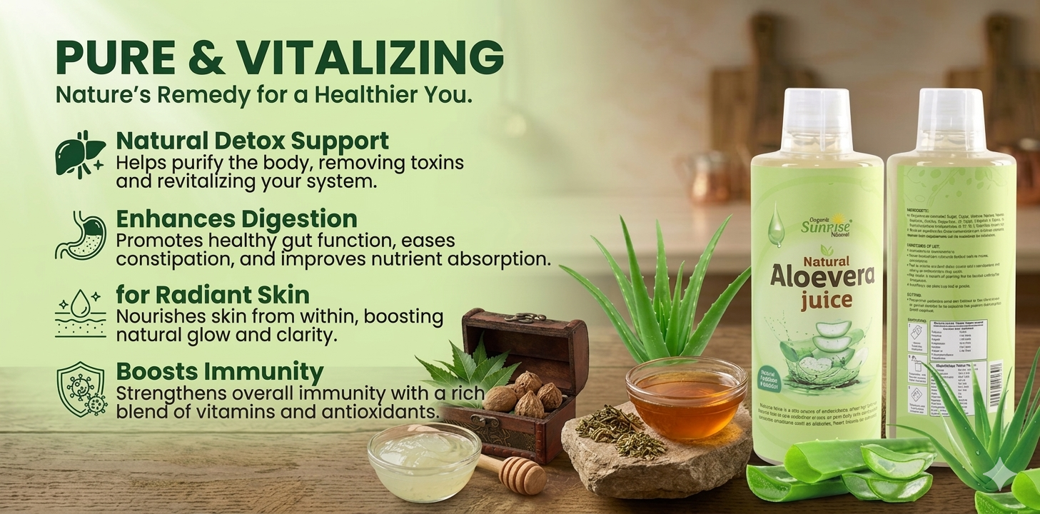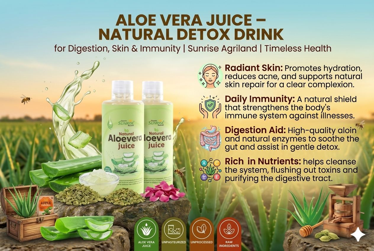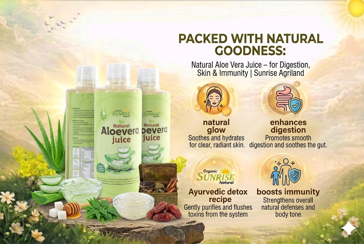 From cleansing the body to enhancing natural glow, kitchens across India rely on Sunrise Agriland Farms. Our Aloe Vera Juice delivers the goodness of aloe vera with essential nutrients—bringing together detox, hydration, and everyday wellness for a healthier lifestyle.