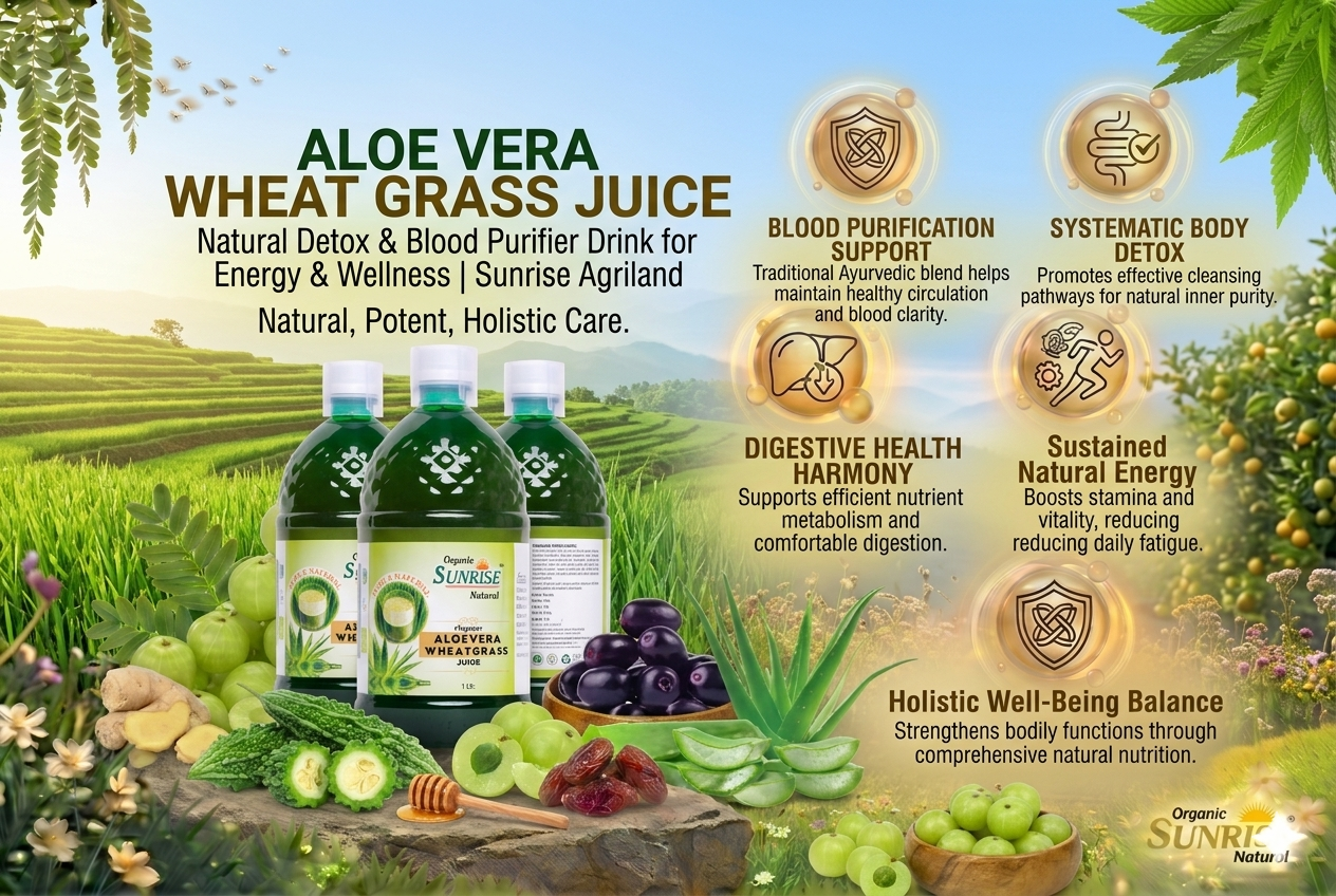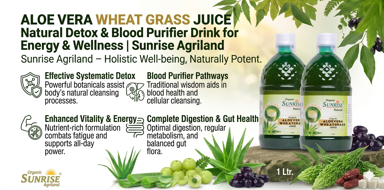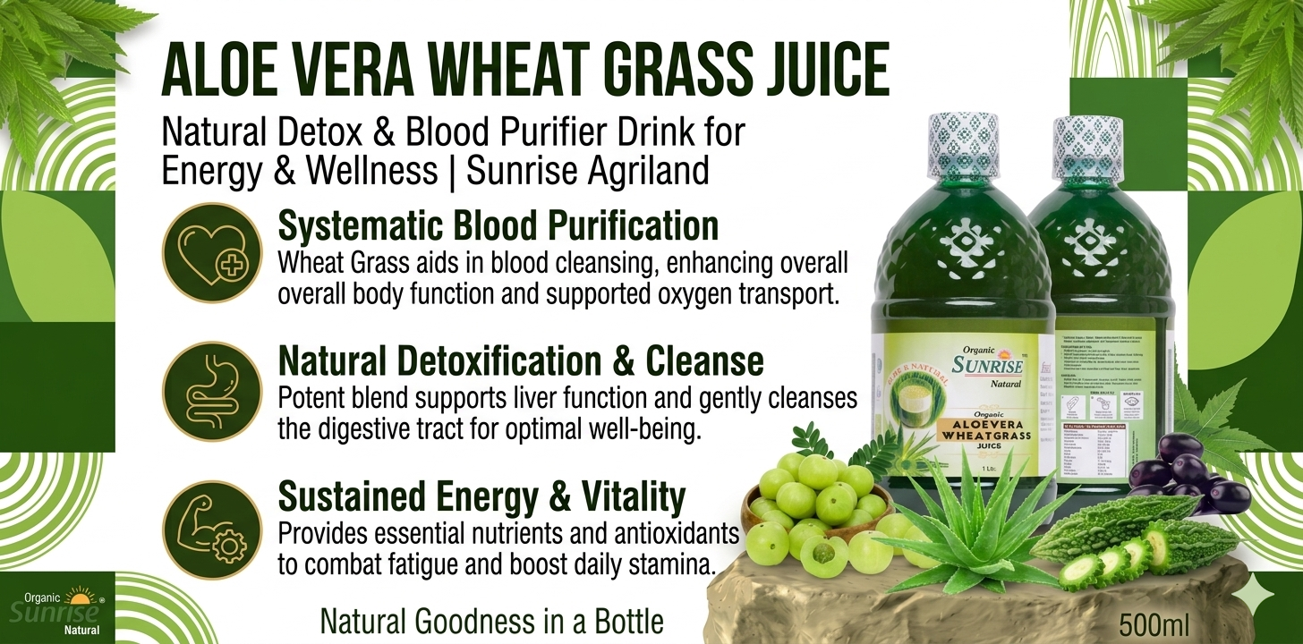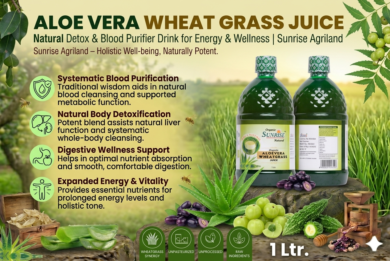 From deep cleansing to everyday wellness, thousands of families rely on Sunrise Agriland Farms. Our Aloe Vera Wheat Grass Juice delivers the goodness of super greens—helping purify the body, boost energy, and promote overall health naturally.