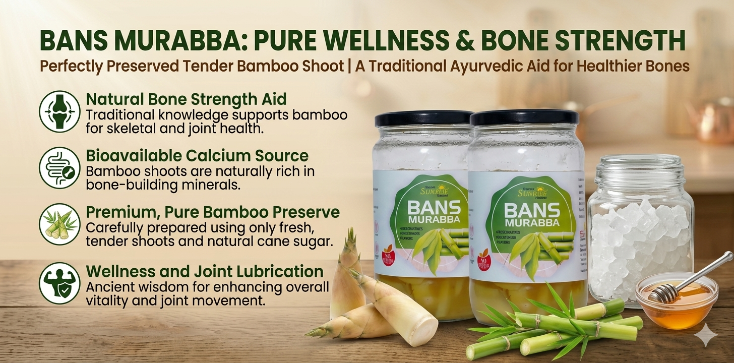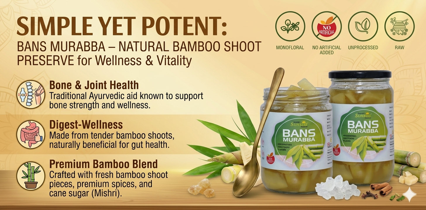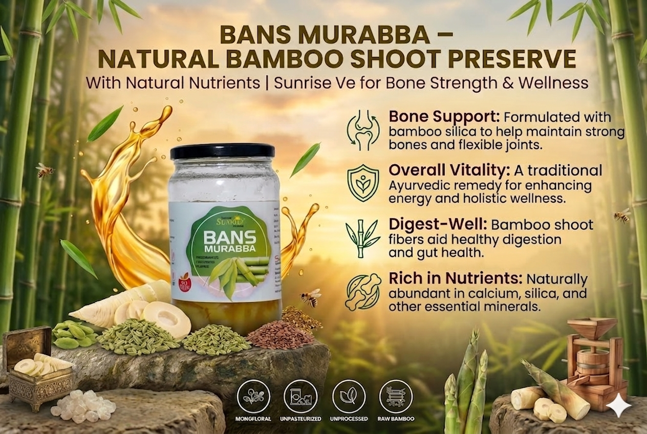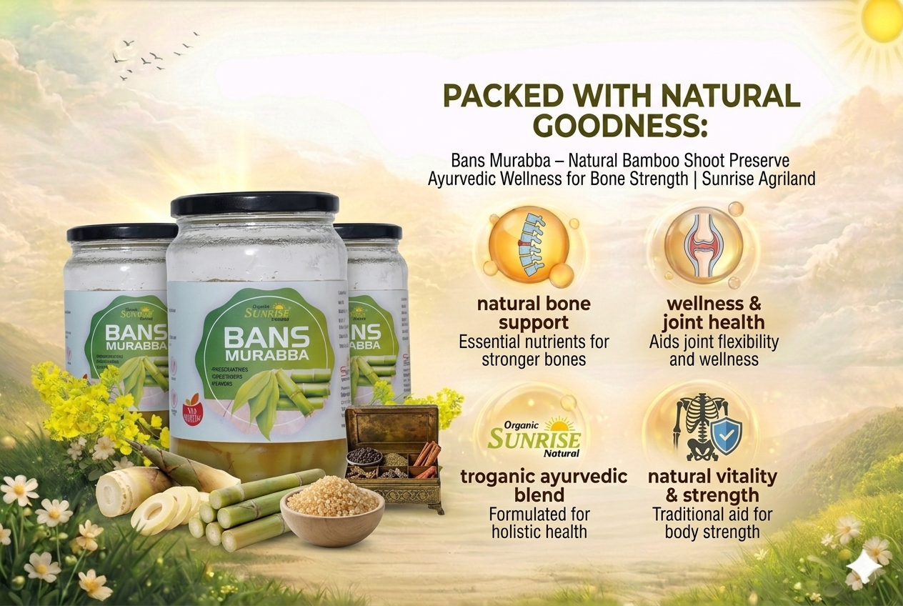 From daily health support to natural strength building, kitchens across India rely on Sunrise Agriland Farms. Our Bans Murabba delivers the goodness of bamboo shoots with Ayurvedic benefits—bringing together tradition, nutrition, and wellness for your everyday lifestyle.