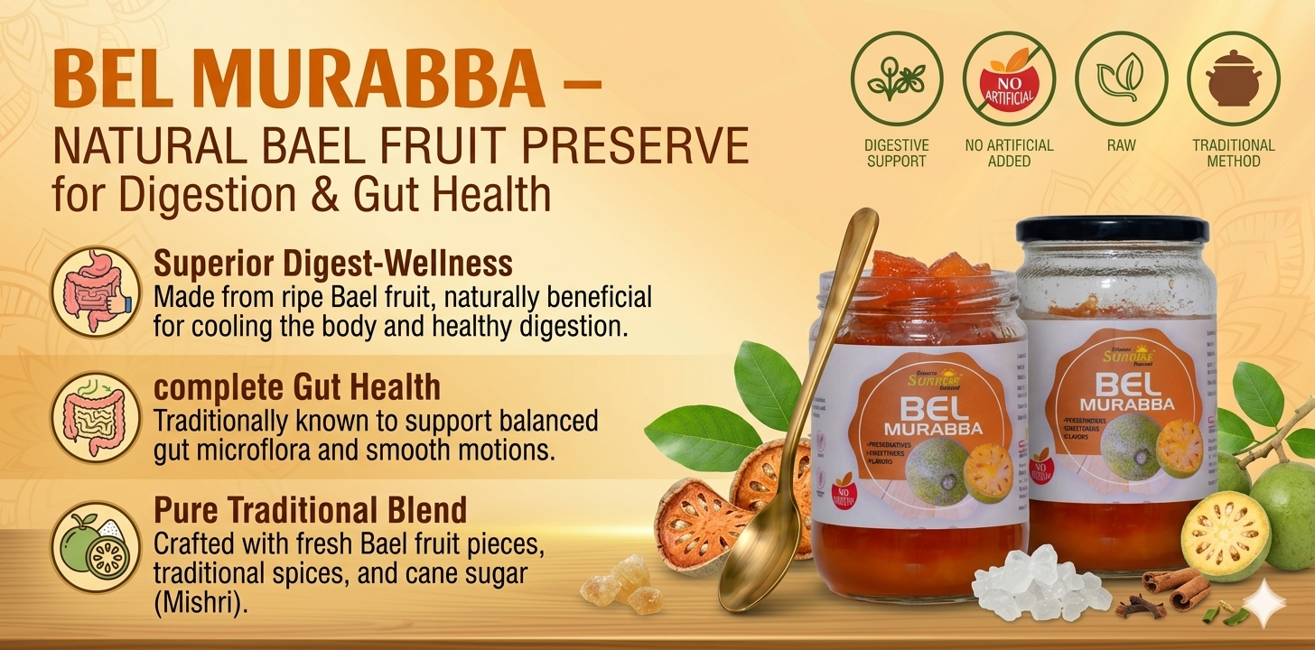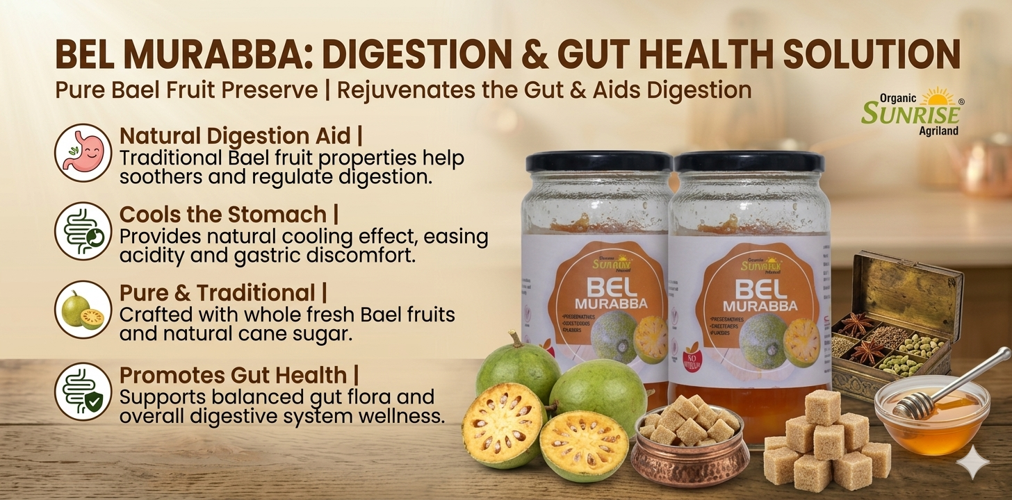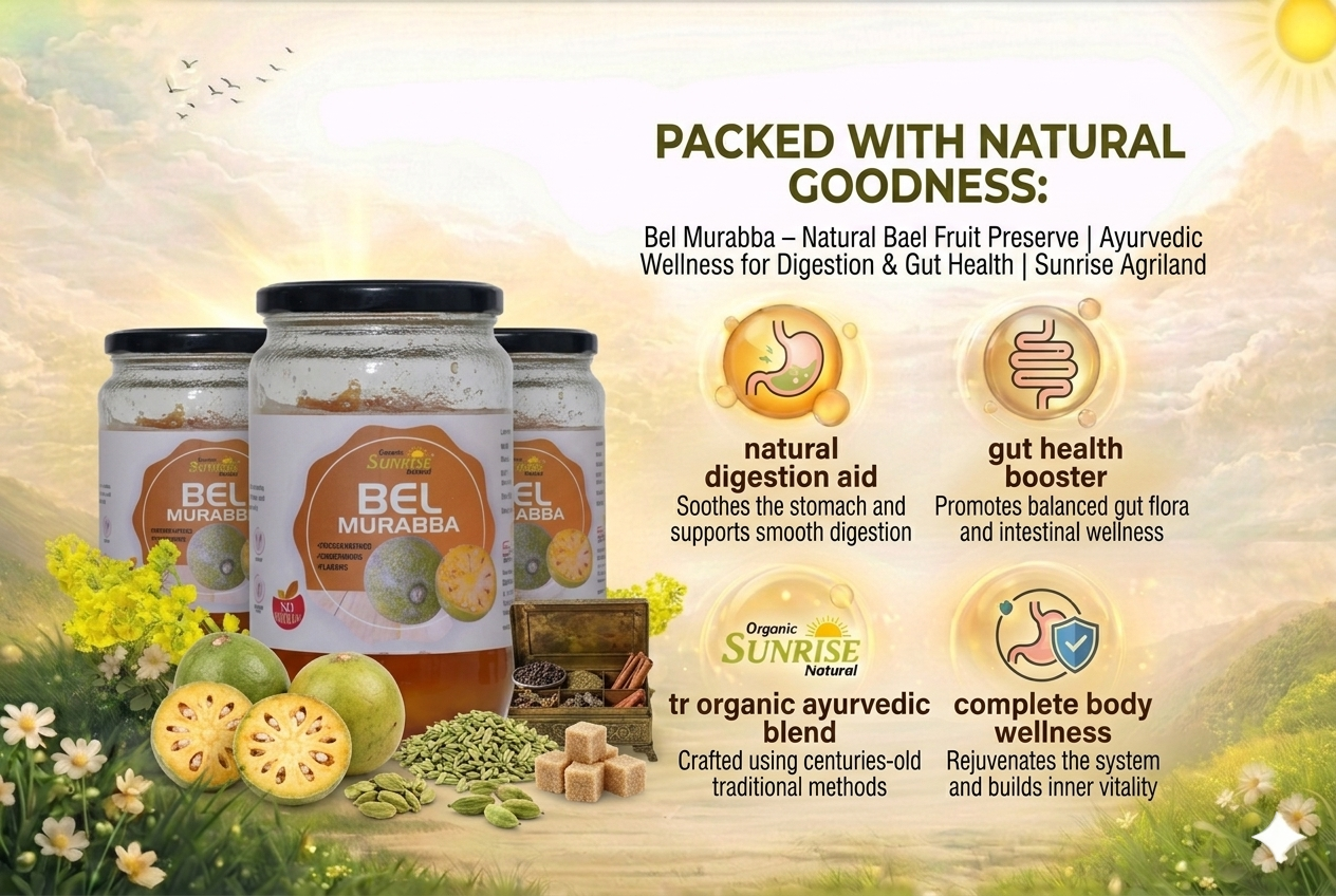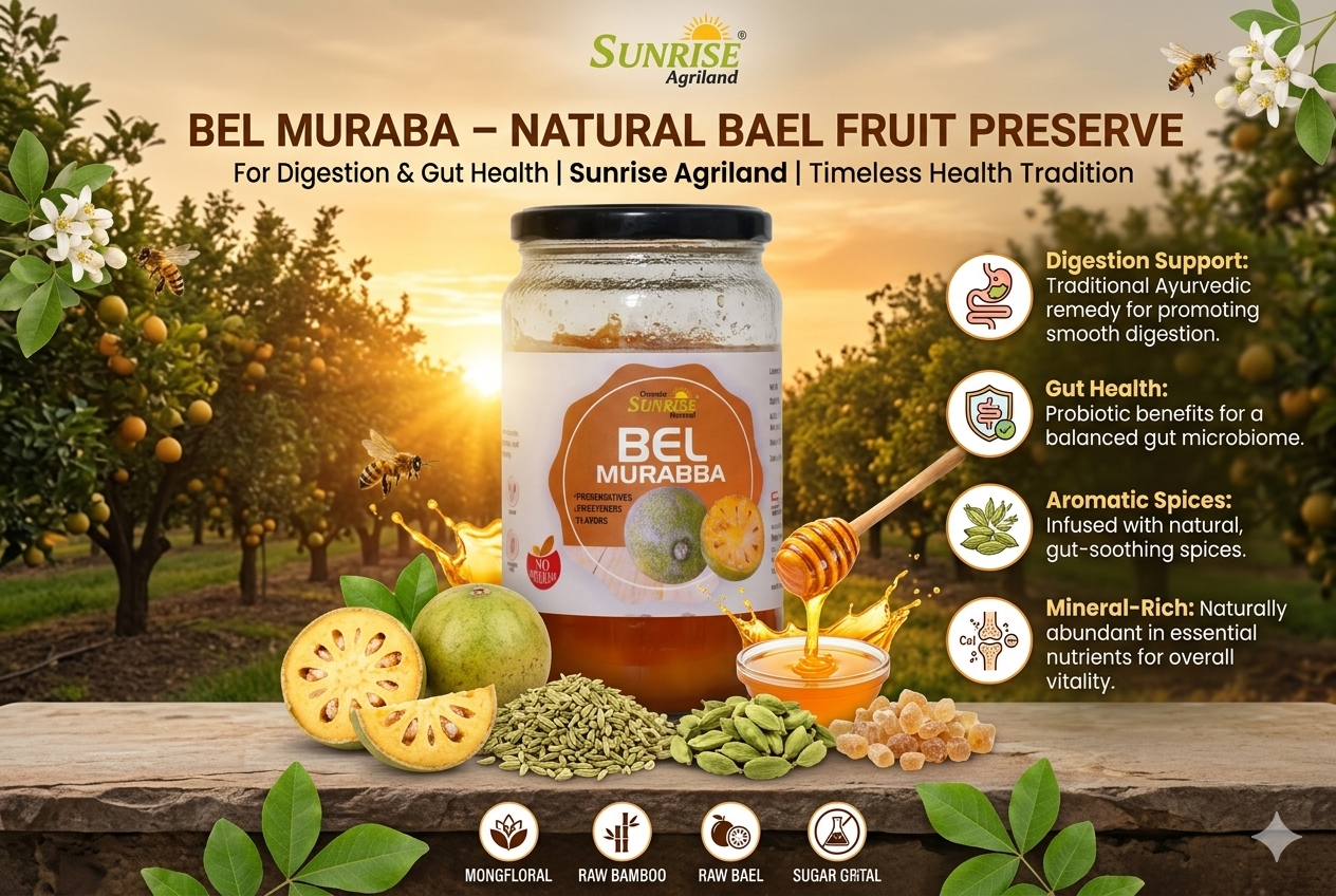 From daily digestive care to natural gut wellness, kitchens across India rely on Sunrise Agriland Farms. Our Bel Murabba delivers the goodness of bael fruit with Ayurvedic benefits—bringing balance, comfort, and health to your everyday routine.