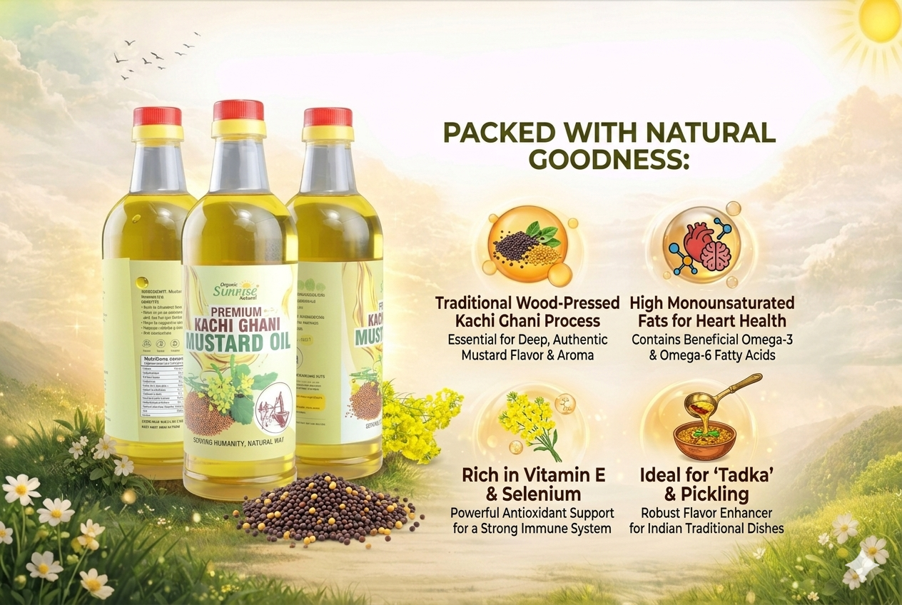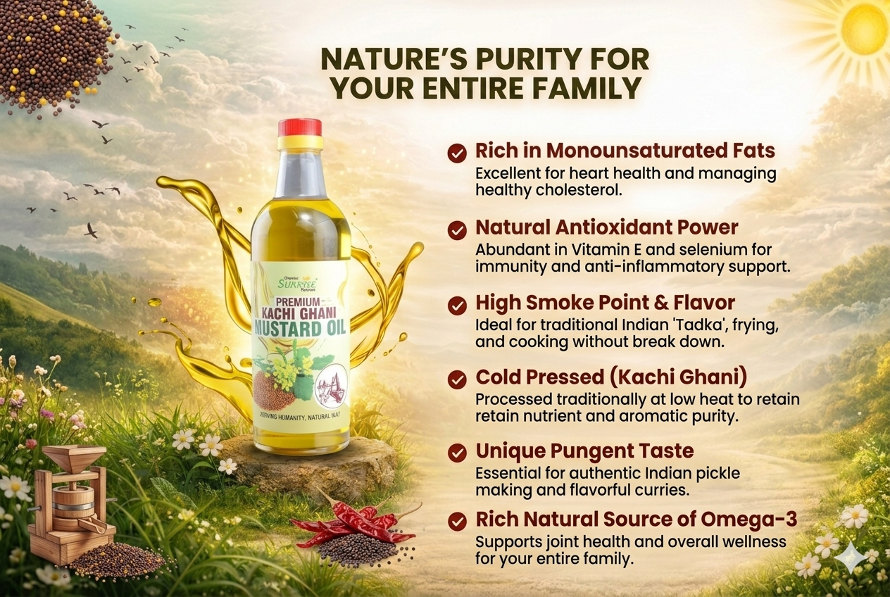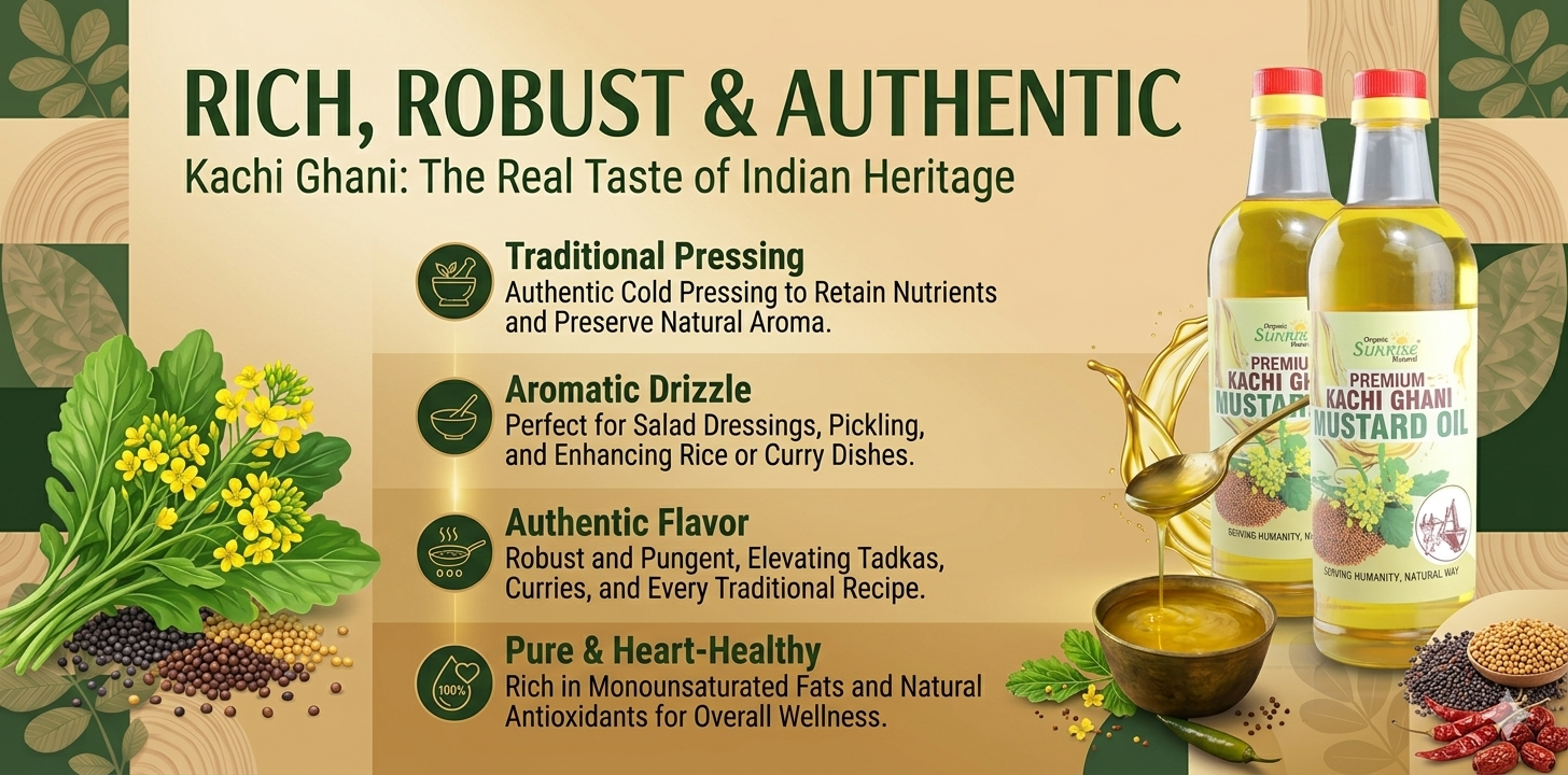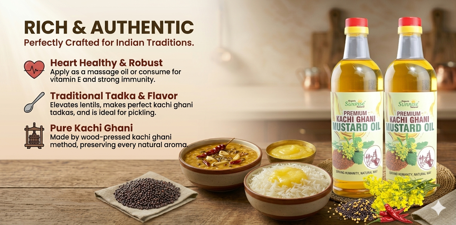 From tadka to traditional delicacies, families across India rely on Sunrise Agriland Farms. Our Cold Pressed Mustard Oil (Kachi Ghani) is crafted using traditional methods to preserve its rich aroma, natural nutrients, and authentic taste—bringing purity and health to your kitchen every day.