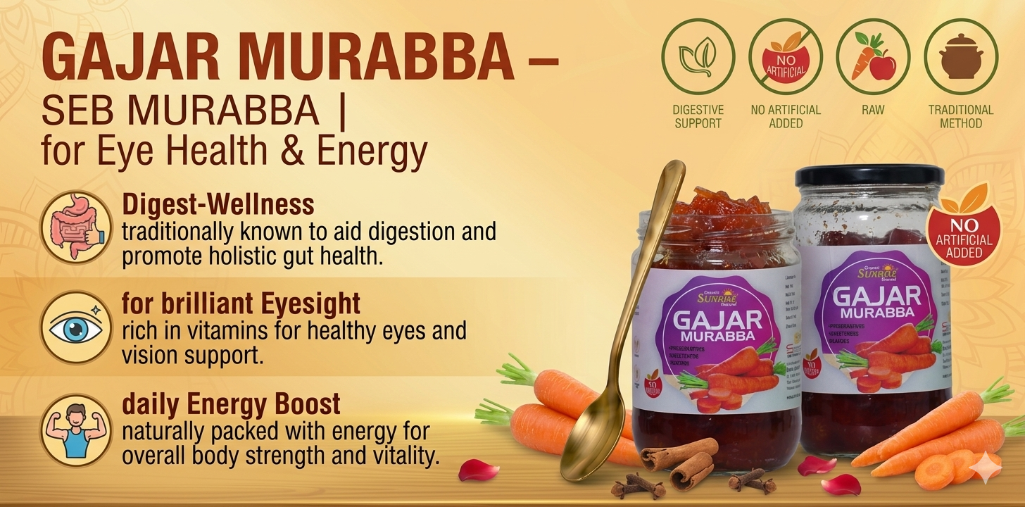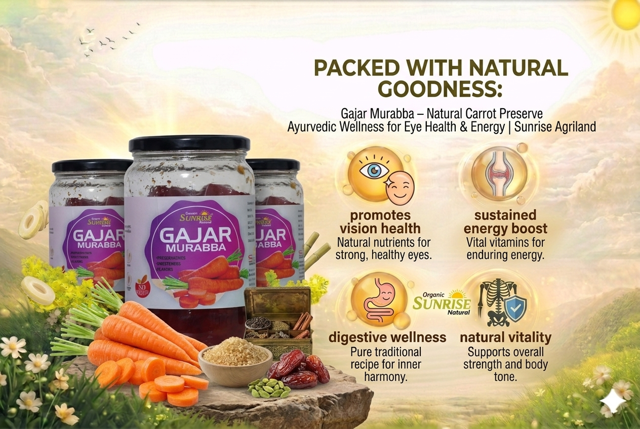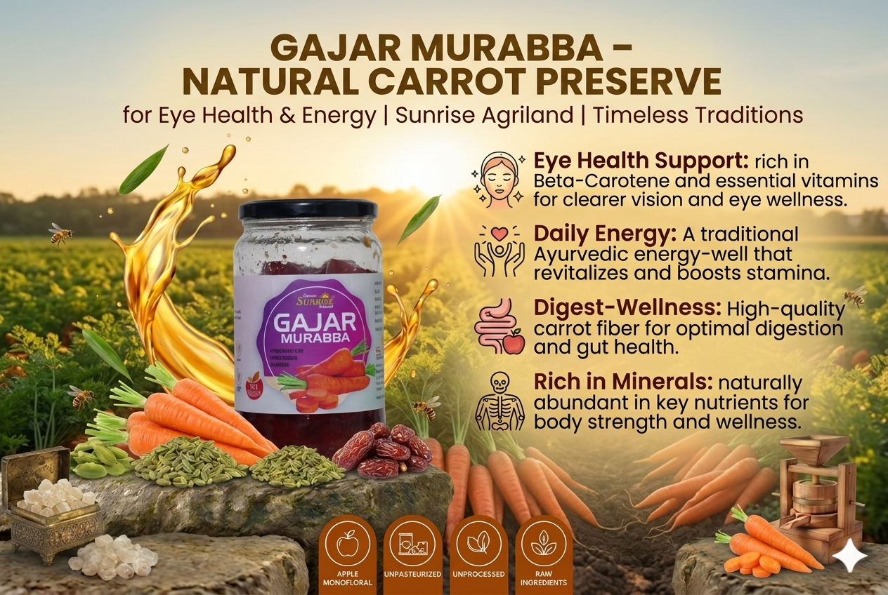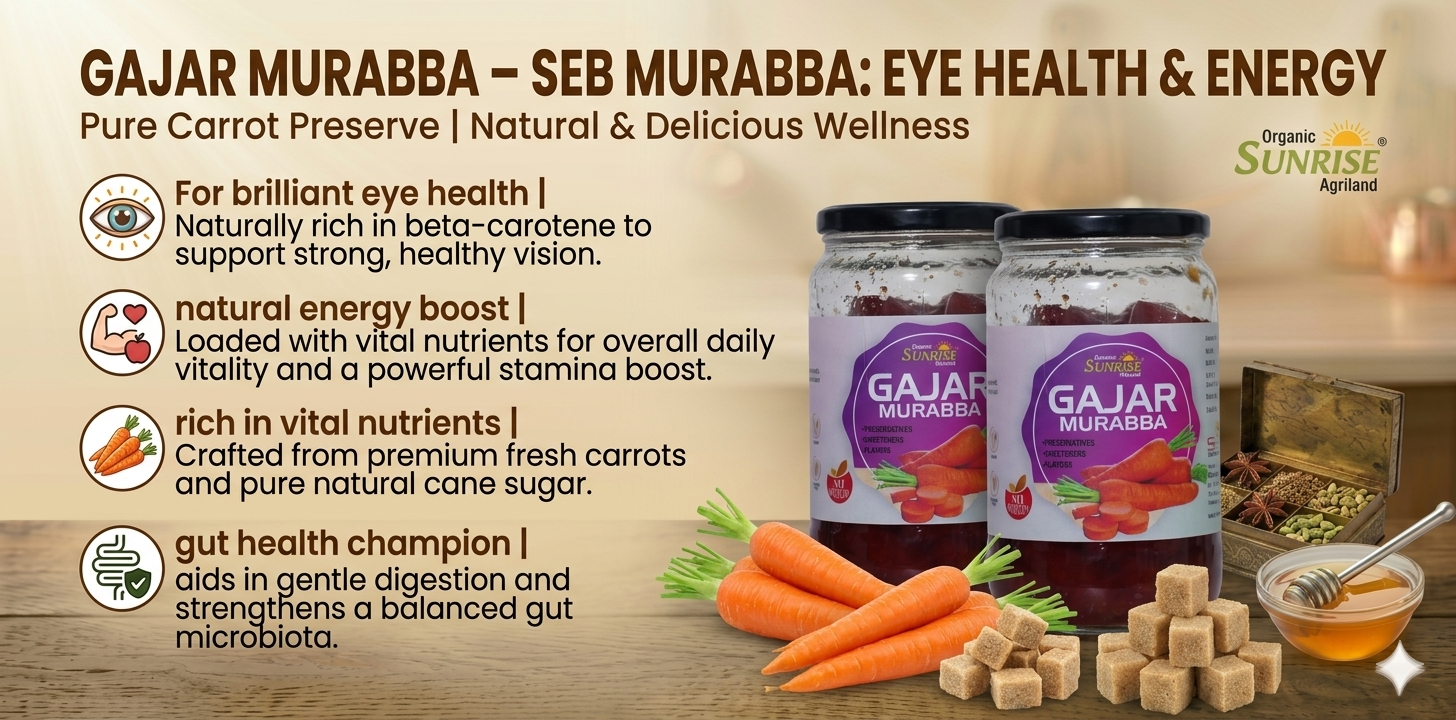 From improving vision to enhancing overall strength, kitchens across India rely on Sunrise Agriland Farms. Our Gajar Murabba delivers the goodness of carrots with essential nutrients—bringing together energy, health, and traditional care for your everyday lifestyle.
