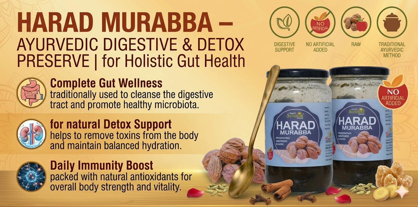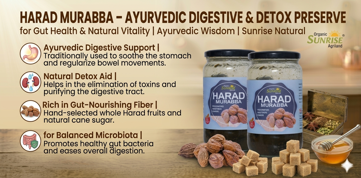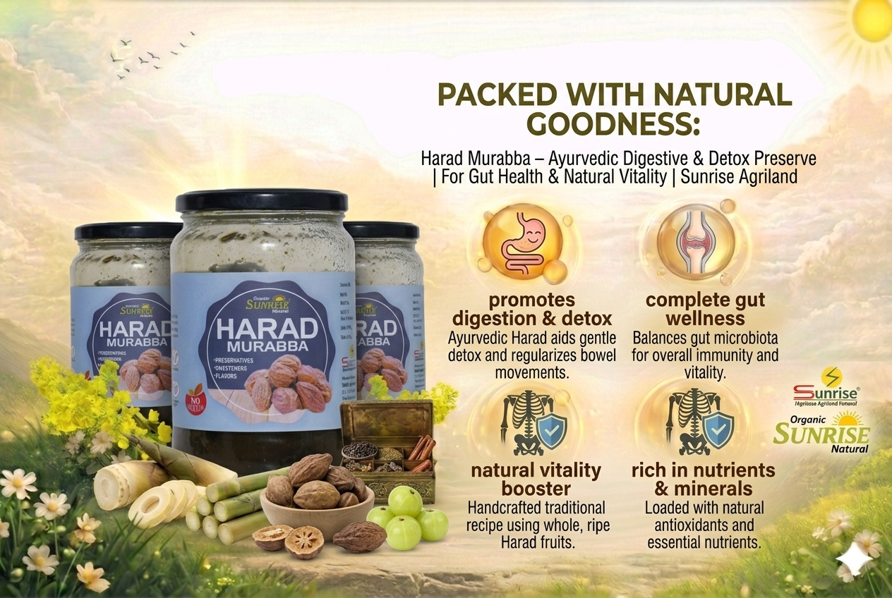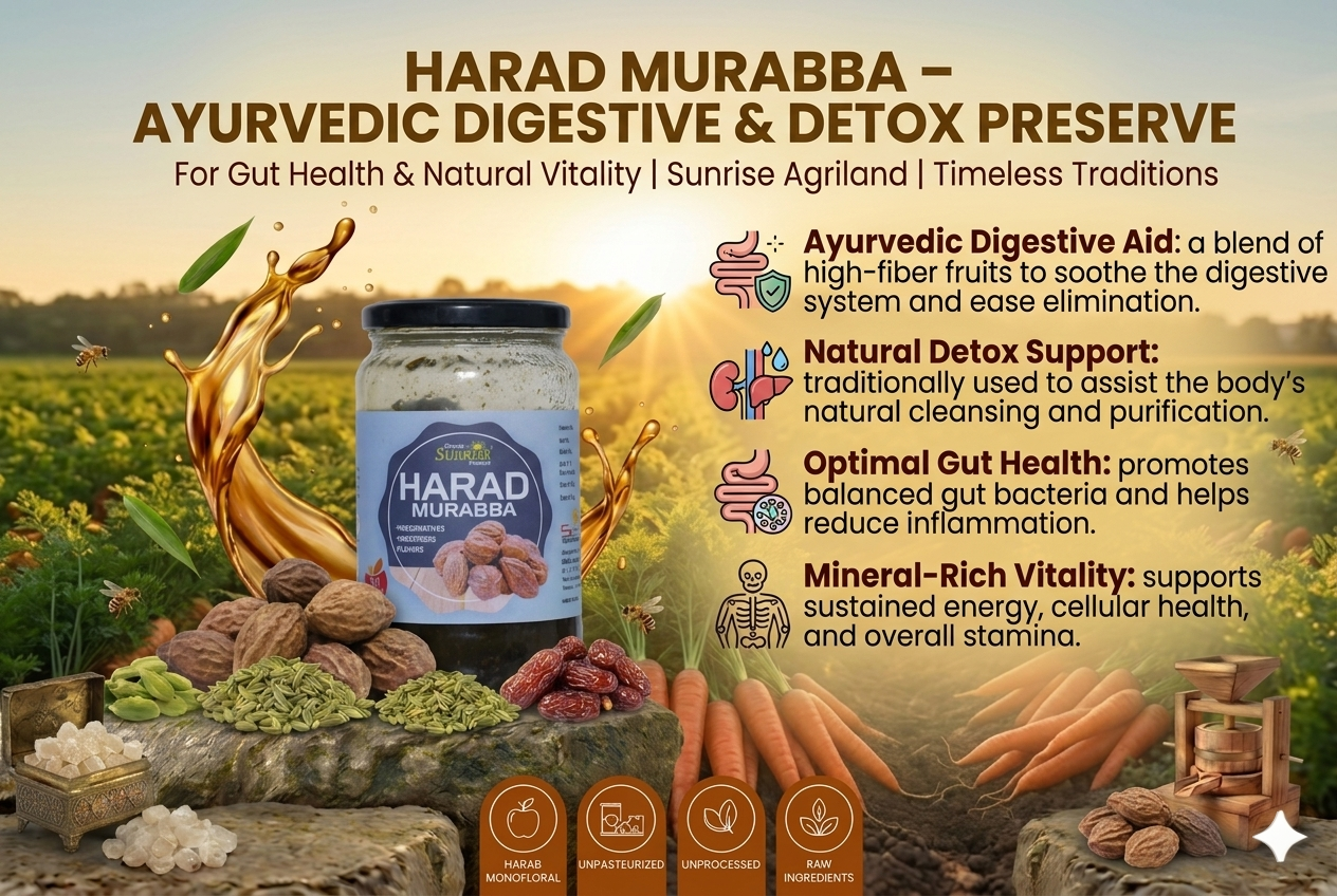 From daily digestive care to natural body detox, kitchens across India rely on Sunrise Agriland Farms. Our Harad Murabba delivers the goodness of haritaki with Ayurvedic benefits—bringing balance, purity, and wellness to your everyday routine.