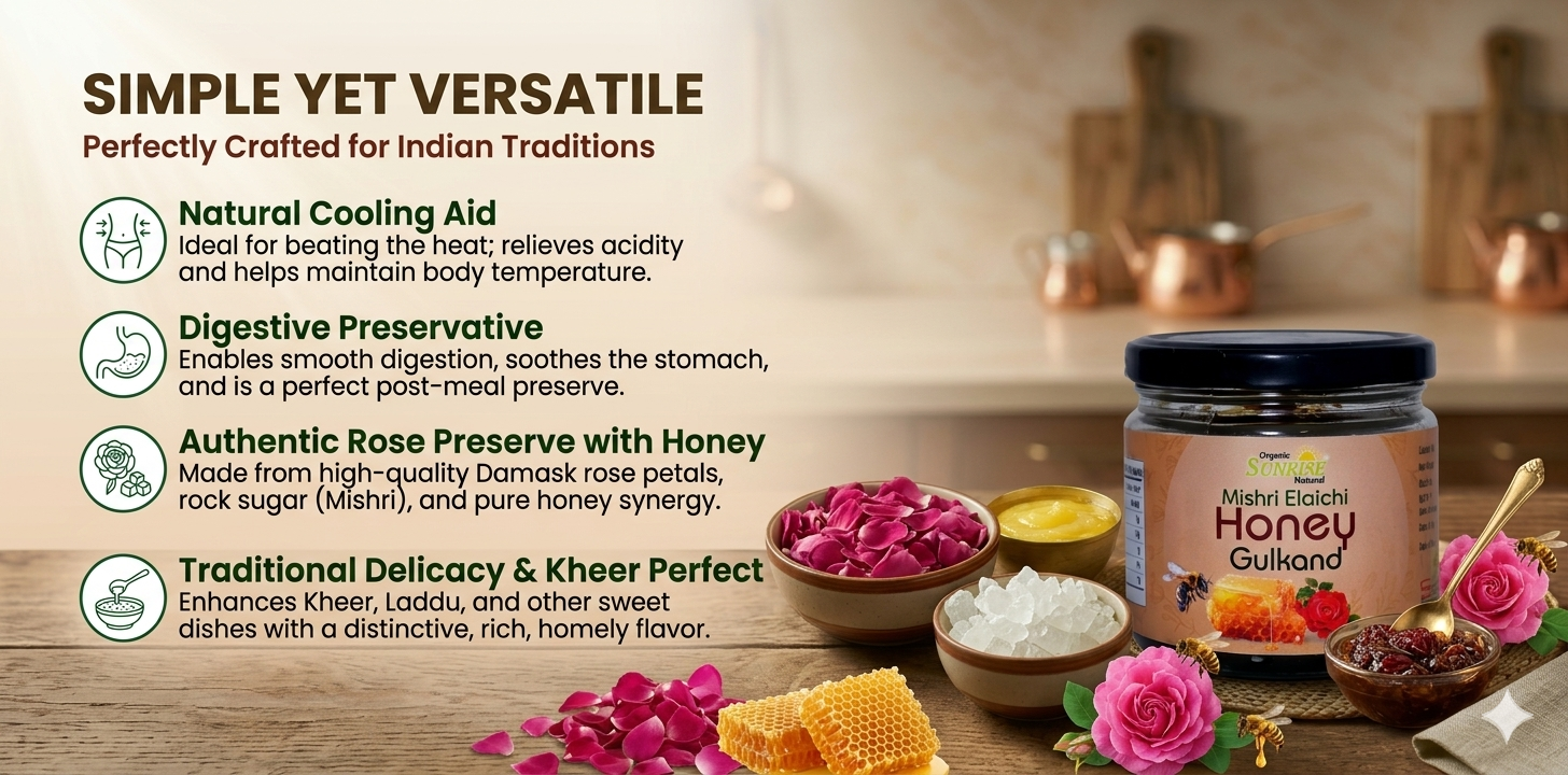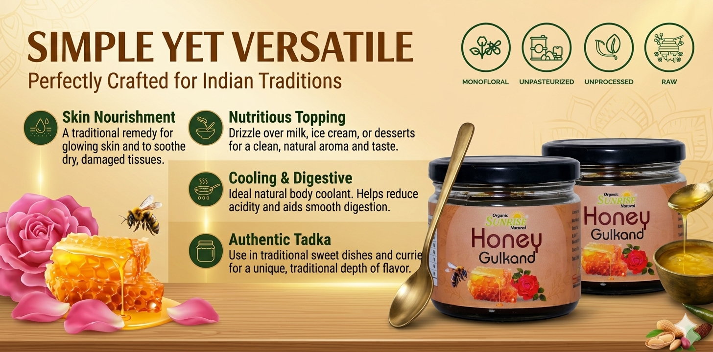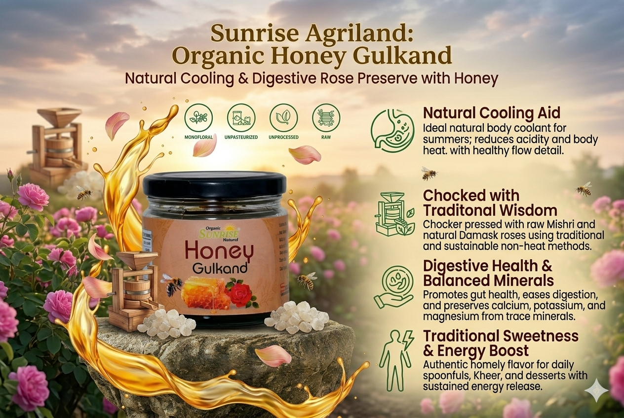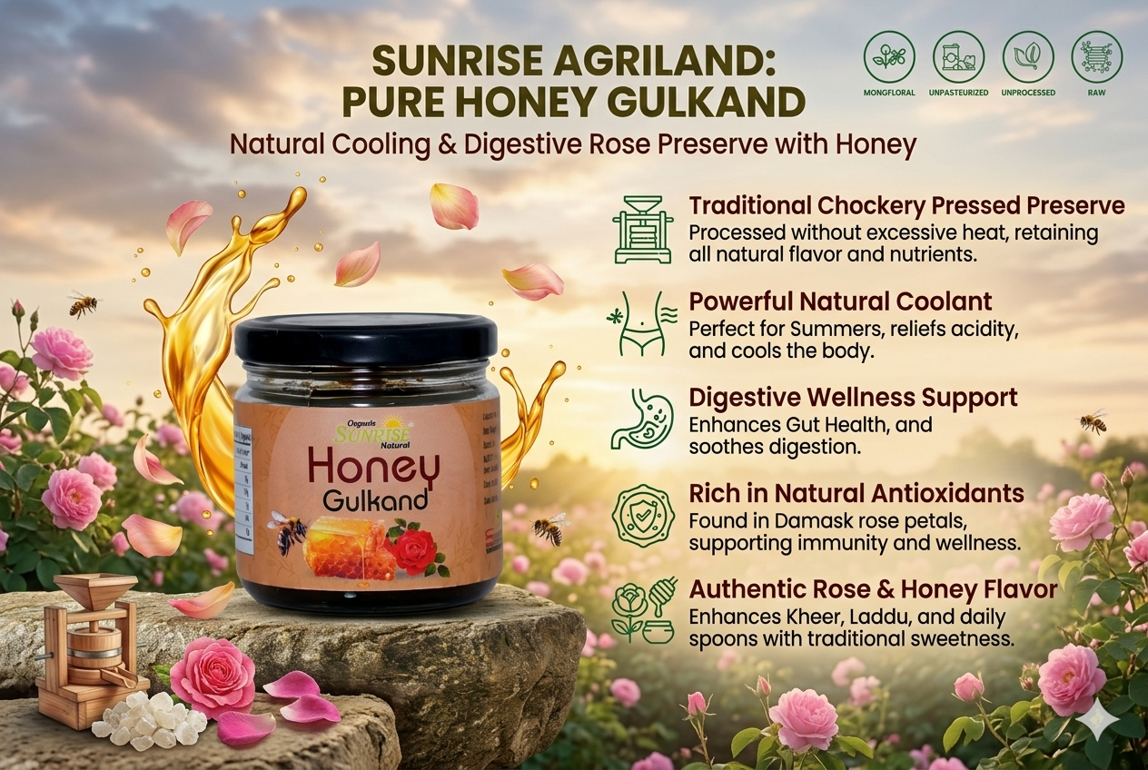 From supporting digestion to keeping the body cool, kitchens across India rely on Sunrise Agriland Farms. Our Honey Gulkand delivers the richness of honey with the goodness of rose petals—bringing together taste, tradition, and wellness for your everyday routine.