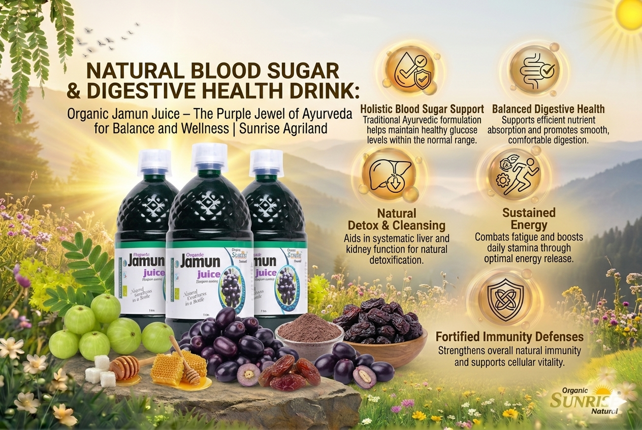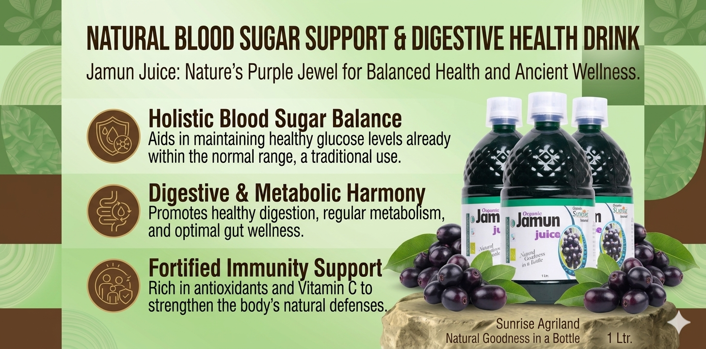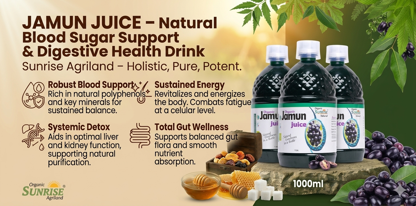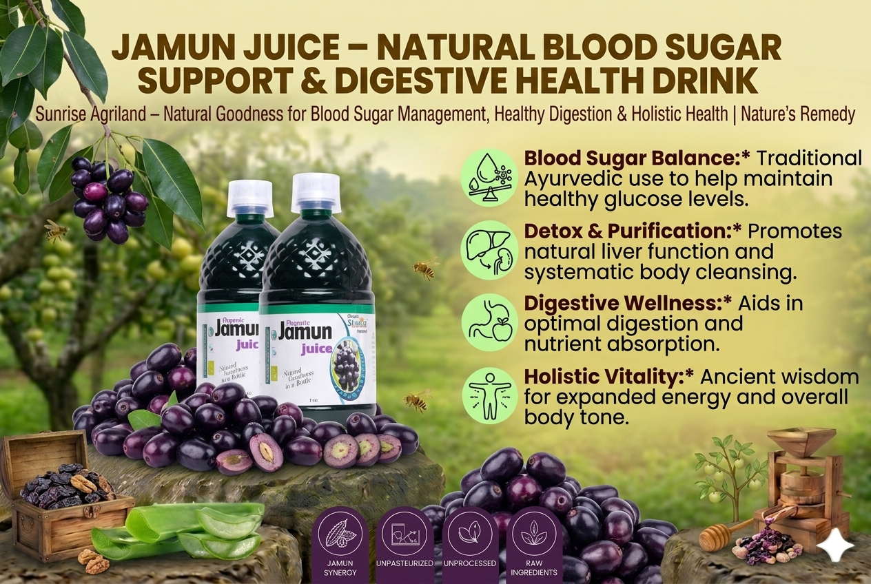 From daily wellness routines to digestive care, thousands of families trust Sunrise Agriland Farms. Our Jamun Juice delivers the natural benefits of jamun—supporting sugar balance, improving gut health, and promoting overall well-being for a healthier lifestyle.