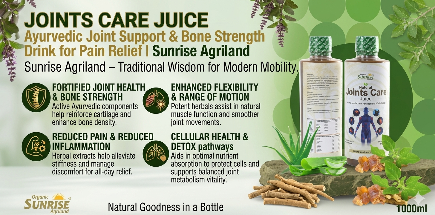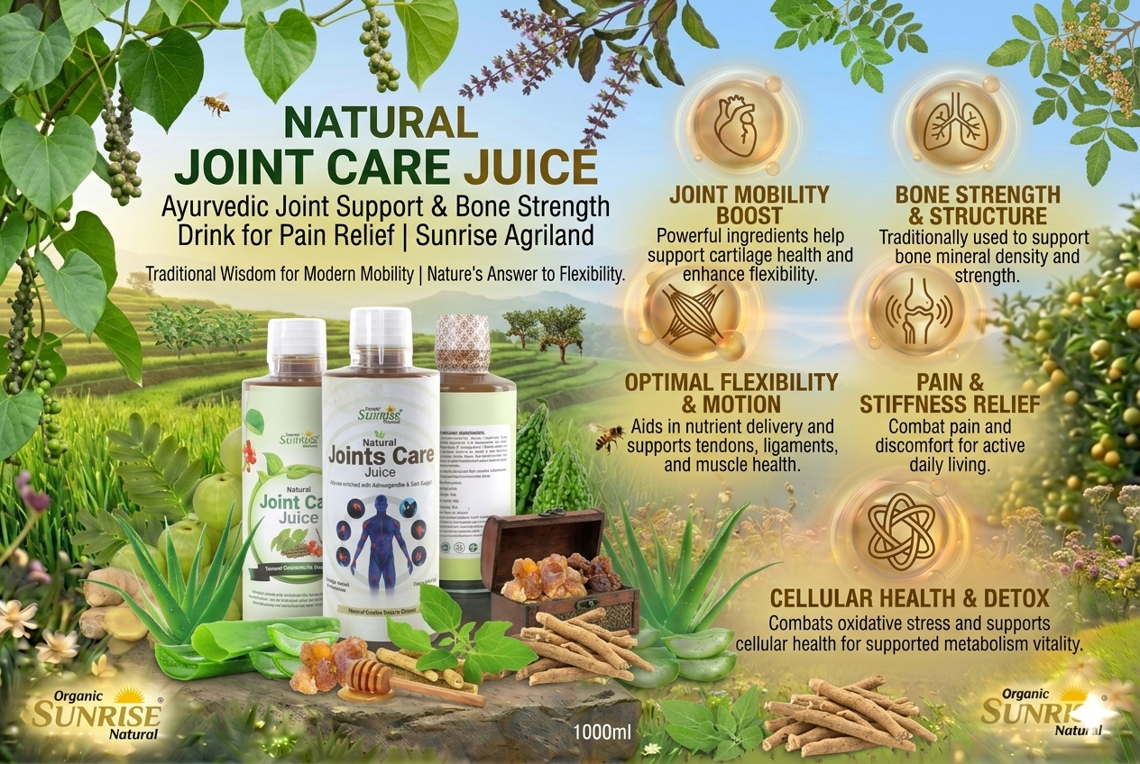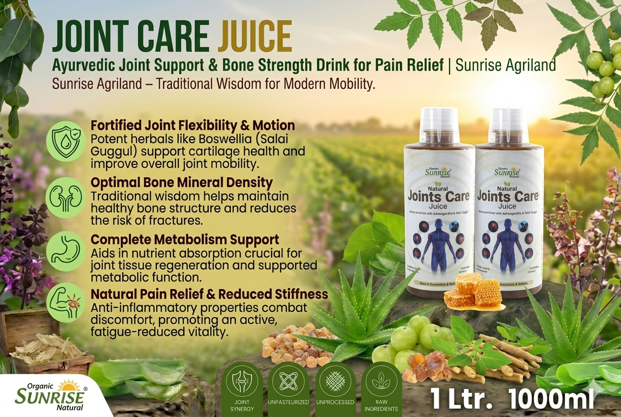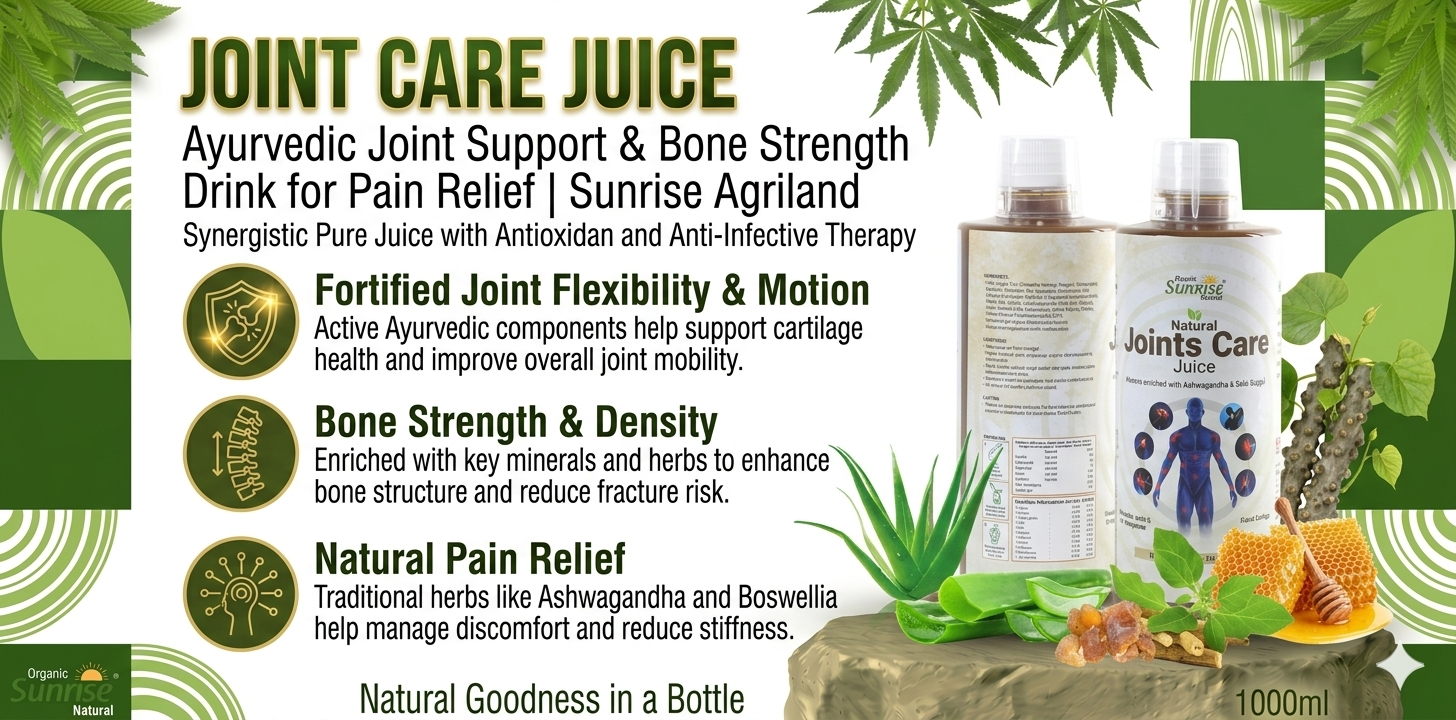 From daily joint care to long-term bone strength, thousands of families rely on Sunrise Agriland Farms. Our Joint Care Juice delivers the goodness of Ayurvedic herbs—helping support flexibility, reduce stiffness, and enhance overall mobility for a healthier lifestyle.