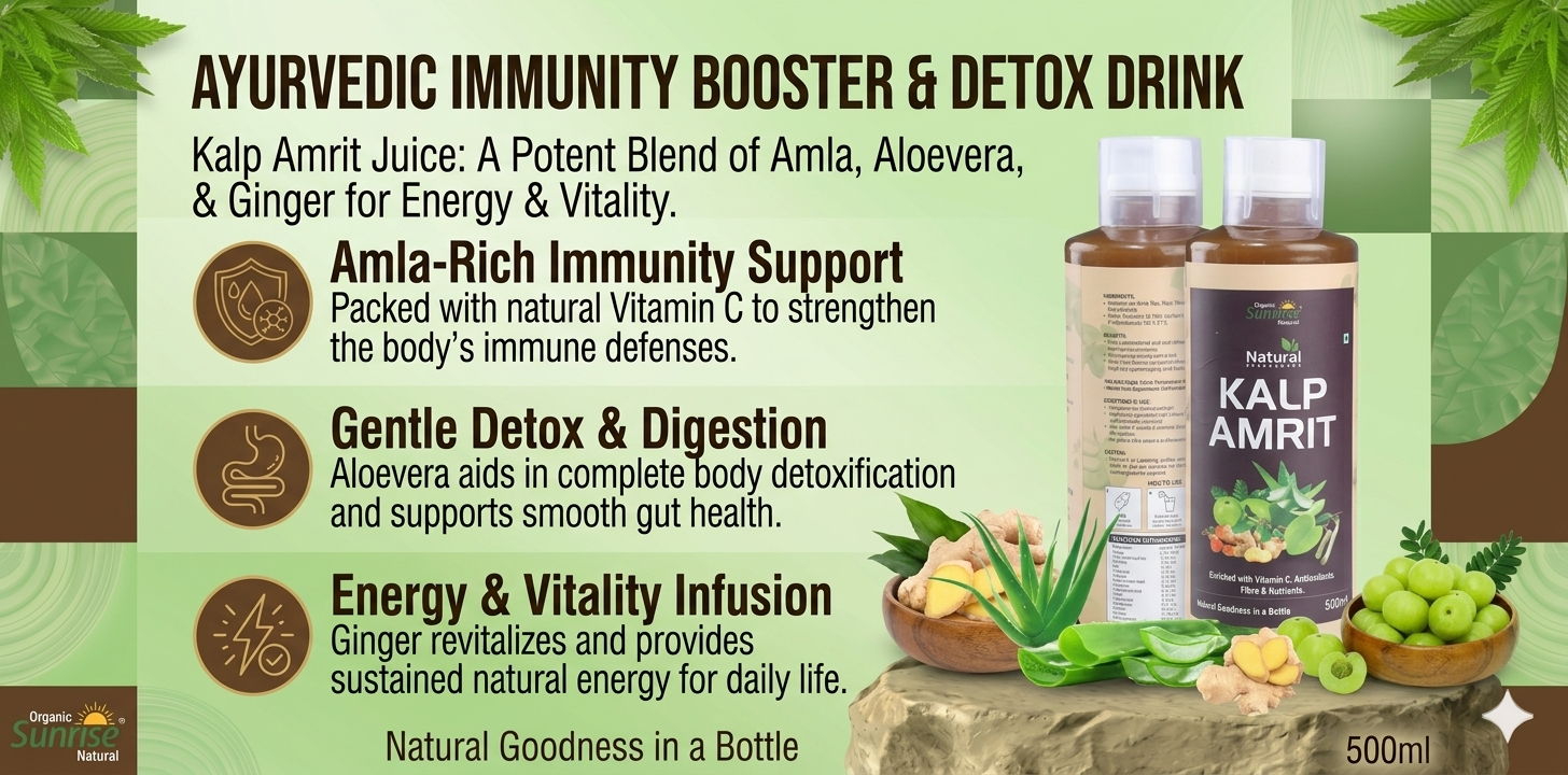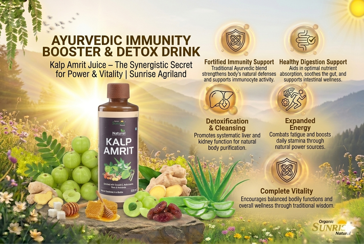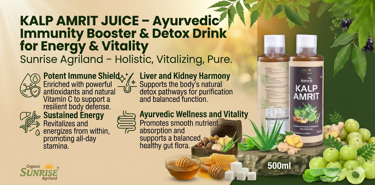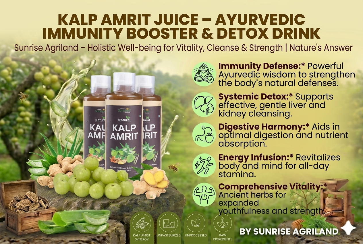 From daily wellness routines to holistic health care, customers across India trust Sunrise Agriland Farms. Our Kalp Amrit Juice blends powerful Ayurvedic herbs—helping boost immunity, improve energy, and support complete body detox naturally.