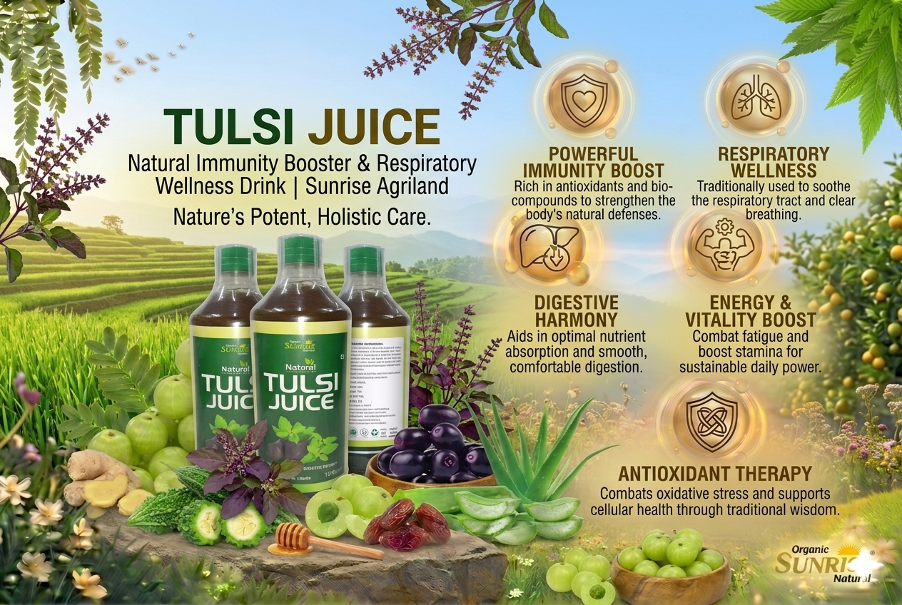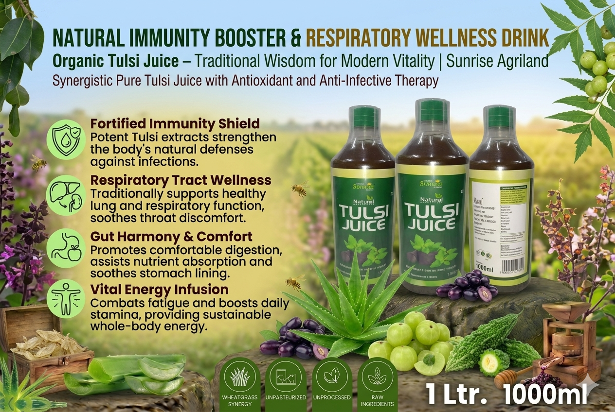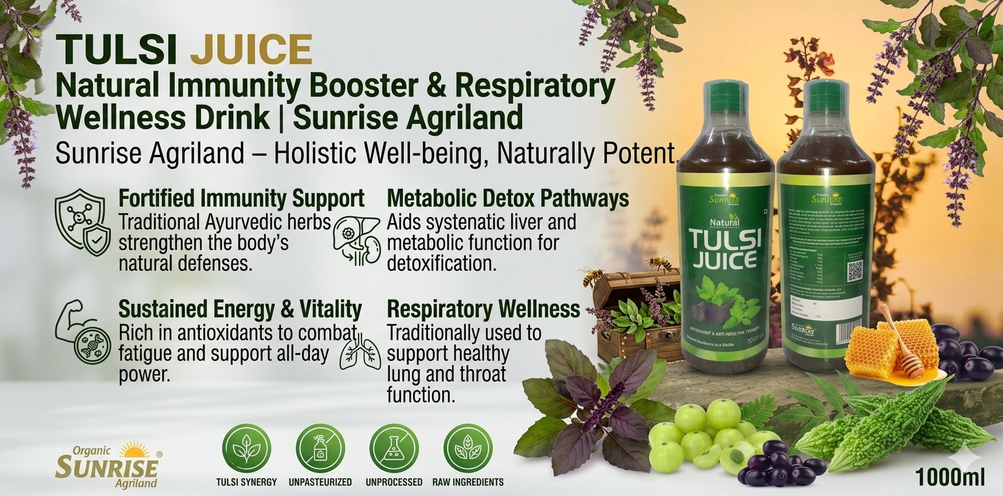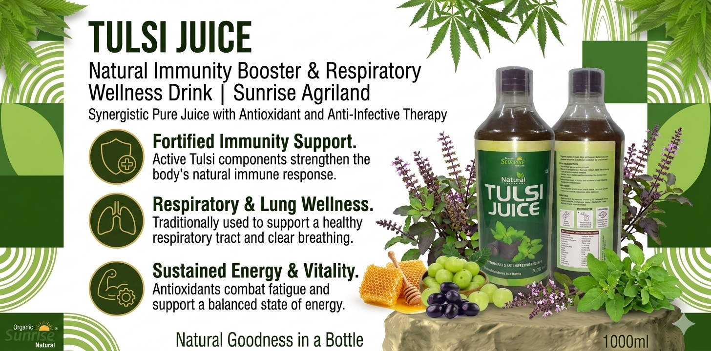 From daily wellness routines to seasonal protection, thousands of families rely on Sunrise Agriland Farms. Our Tulsi Juice combines the power of Ayurvedic herbs—helping support immunity, respiratory health, and a balanced lifestyle.